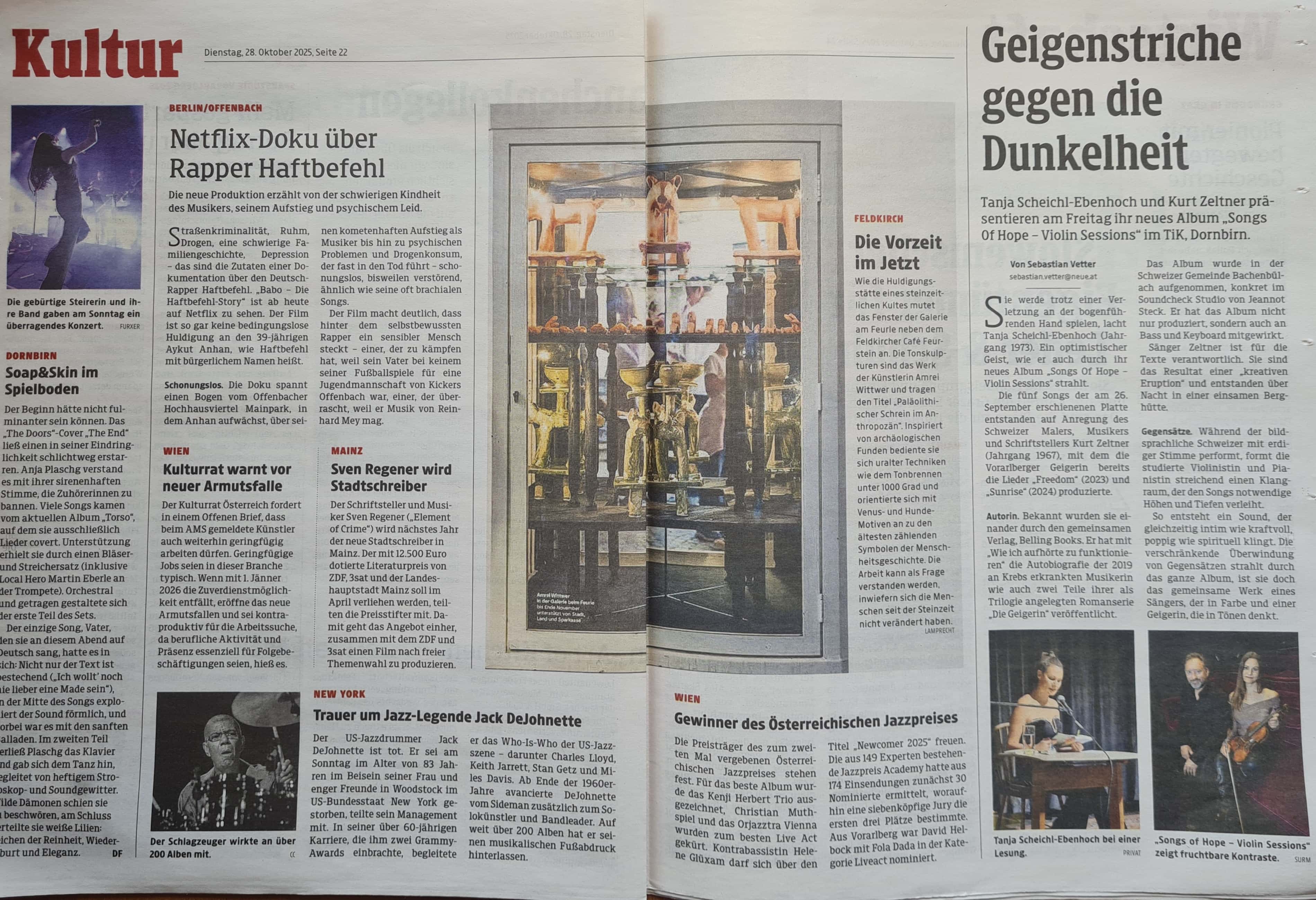 Die Objekte des Schreins sind angelehnt an bis zu 40.000 Jahre alte archäologische, mitteleuropäische Funde, Altes wurde mit Neuem kombiniert. Die Objekte erwecken den Anschein, als dienten sie dazu, den Austausch mit „dem Anderen“ zu erleichtern und zu ermöglichen, ins Ungleichgewicht geratene Beziehungen mit der immateriellen Welt zu kitten. Stille Zeugen eines verlorenen Kults – oder eines kommenden? Replik oder funktionales Werkzeug? Die Artefakte sind präsentiert als Installation in einem Schrein aus Holz, Glas und Spiegel im Schaufenster neben dem Café Feurstein: Was bedeutet es, in einer Zeit zu leben, in der der Mensch die Biosphäre verändert – im Anthropozän? Woran glauben wir, wer trägt Verantwortung und was hoffen wir?
