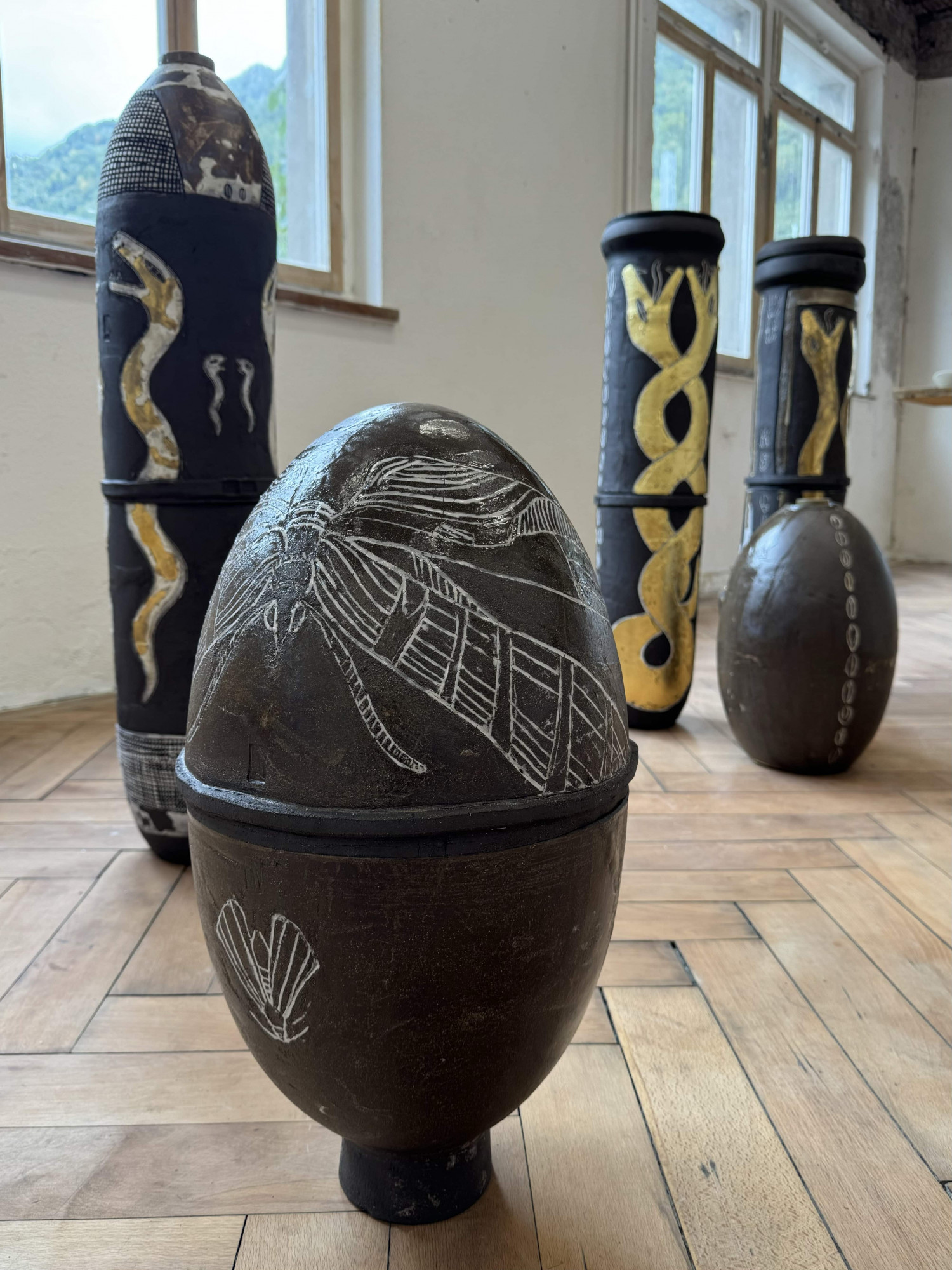 «Die großen, mit archaischen Symbolen und Figuren geschmückten Keramikgefäße appellieren an die Ursprünge der menschlichen Kultur, an die Wertschätzung des gesunden Körpers als Mittel zur mystischen Erfahrung und an Aspekte von alle und alles verbindenden Elementen, Ritualen und Formen.»