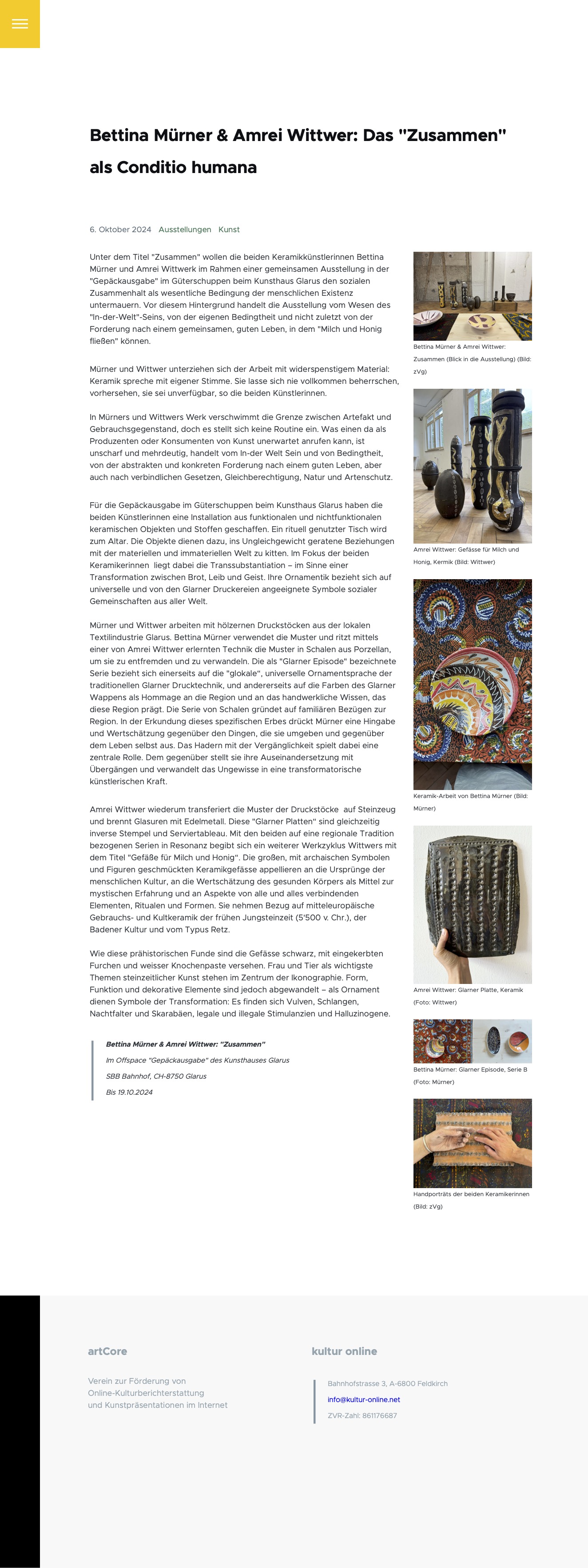 Bettina Mürner und Amrei Wittwer unterziehen sich der Arbeit mit widerspenstigem Material: Keramik spricht mit eigener Stimme. Sie lässt sich nie vollkommen beherrschen, vorhersehen, sie sind unverfügbar. In Mürners und Wittwers Werk verschwimmt die Grenze zwischen Artefakt und Gebrauchsgegenstand, doch es stellt sich keine Routine ein. Was uns da als Produzenten oder Konsumenten von Kunst unerwartet anrufen kann, ist unscharf und mehrdeutig: Handelt vom In-der Welt Sein und von Bedingtheit. Von der abstrakten und konkreten Forderung nach einem guten Leben, aber auch nach verbindlichen Gesetzen, Gleichberechtigung, Natur und Artenschutz.