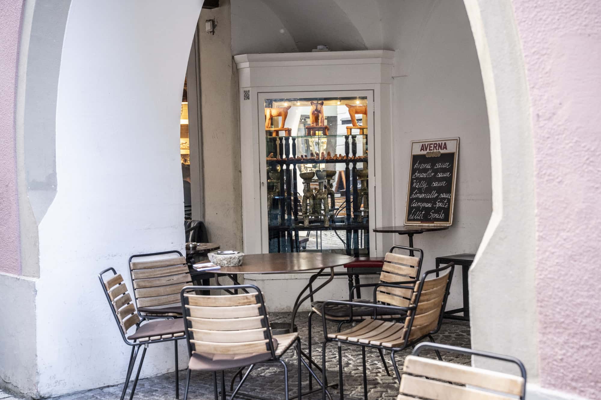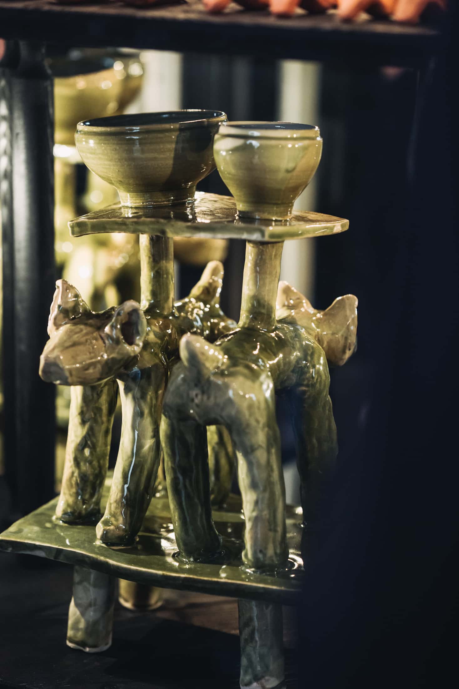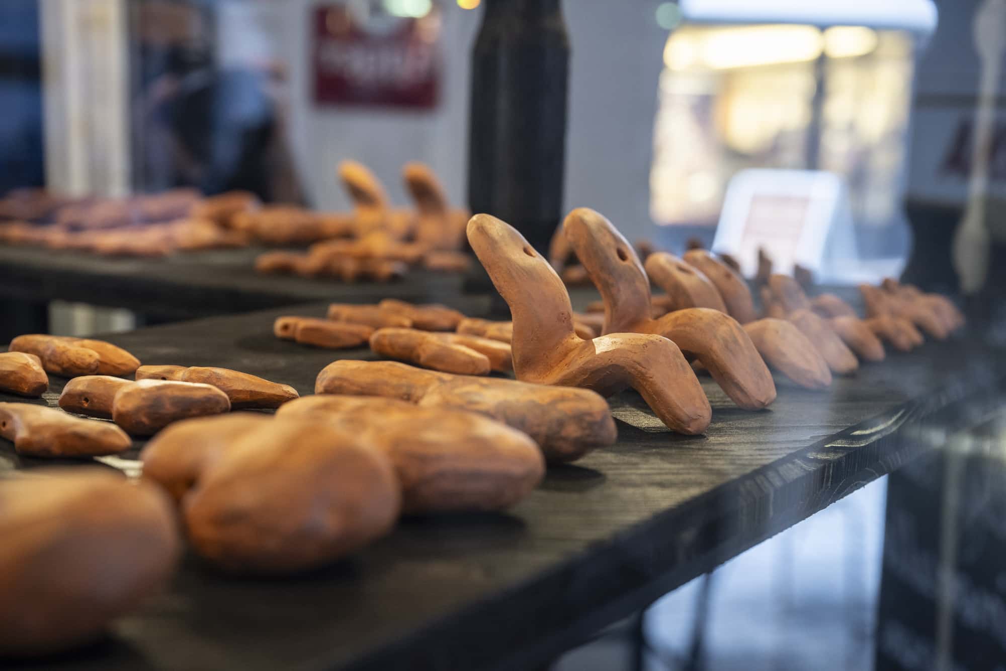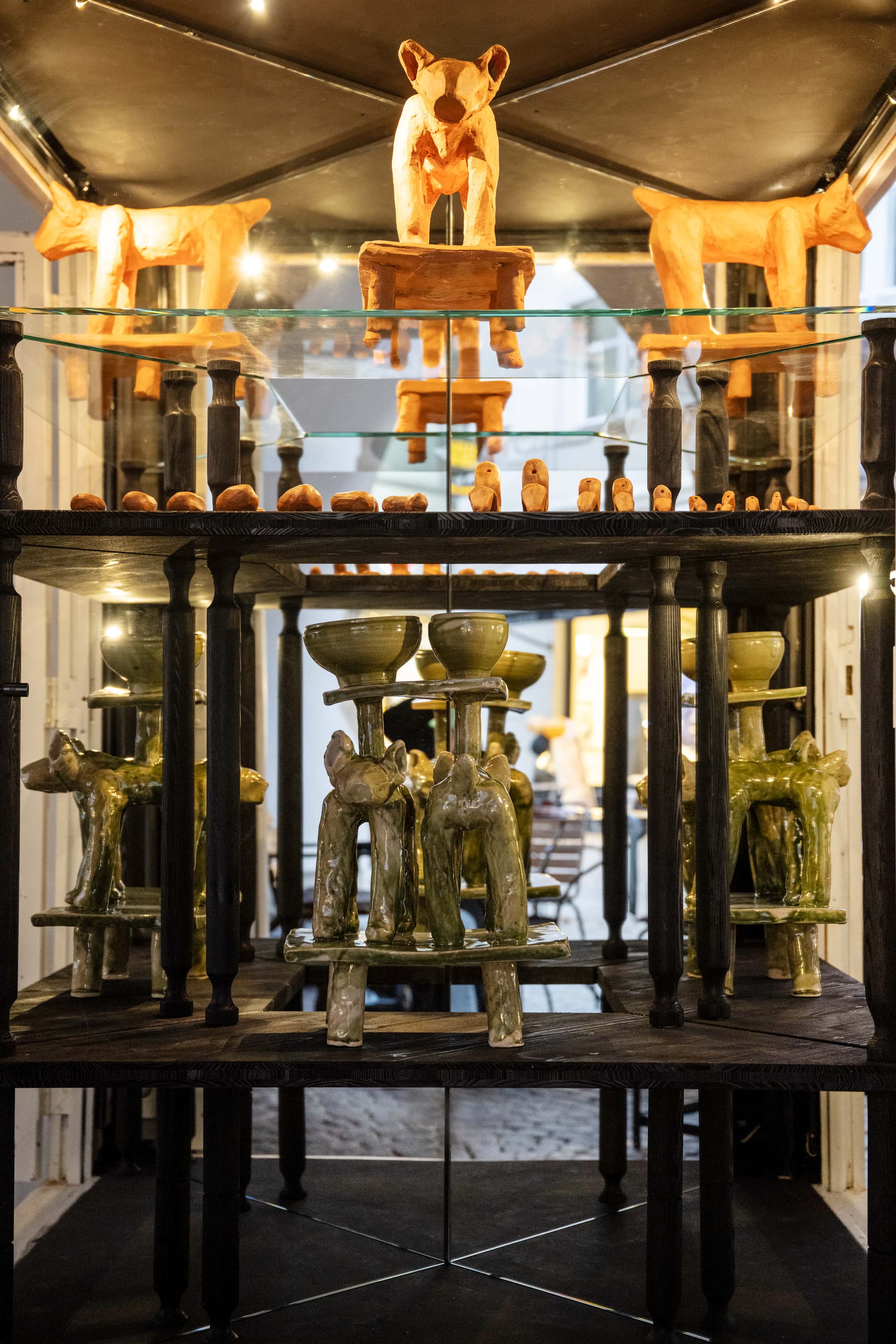 Die Objekte des Schreins sind angelehnt an bis zu 40.000 Jahre alte archäologische, mitteleuropäische Funde, Altes wurde mit Neuem kombiniert. Die Objekte erwecken den Anschein, als dienten sie dazu, den Austausch mit „dem Anderen“ zu erleichtern und zu ermöglichen, ins Ungleichgewicht geratene Beziehungen mit der immateriellen Welt zu kitten. Stille Zeugen eines verlorenen Kults – oder eines kommenden? Replik oder funktionales Werkzeug? Die Artefakte sind präsentiert als Installation in einem Schrein aus Holz, Glas und Spiegel im Schaufenster neben dem Café Feurstein: Was bedeutet es, in einer Zeit zu leben, in der der Mensch die Biosphäre verändert – im Anthropozän? Woran glauben wir, wer trägt Verantwortung und was hoffen wir?