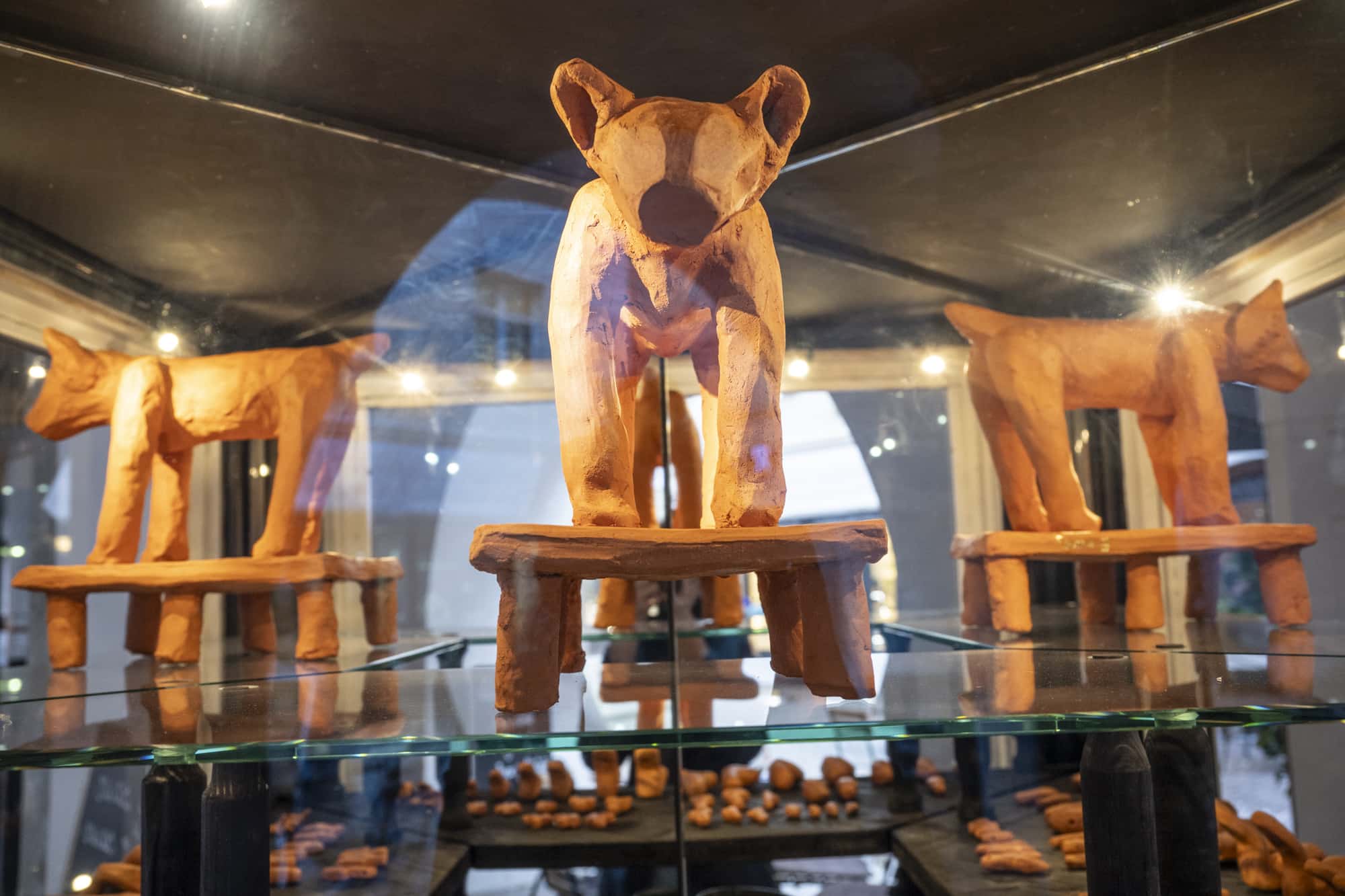 Diese Objekte des Schreins sind – wie bei einzelnen historischen Funden – in Form von Hunden ausgearbeitet. Die Hunde sind innen hohl, es handelt sich um hermetische Gefässe. Das hermetische Gefäss verweigert sich seiner Funktion, es ist verschlossen. In der Alchemie gilt es als das Behältnis der Gegensätze, es empfängt und nährt die Materie, die verwandelt wird. Die Artefakte können als eine Beschreibung und Beschwörung der Natur mit den Mitteln des Antropozän verstanden werden. Sie tragen anstatt der Einritzung von Spiralen, Dreiecken und Zickzack der neolitischen Funde eine heute gültige, mathematische Formel,